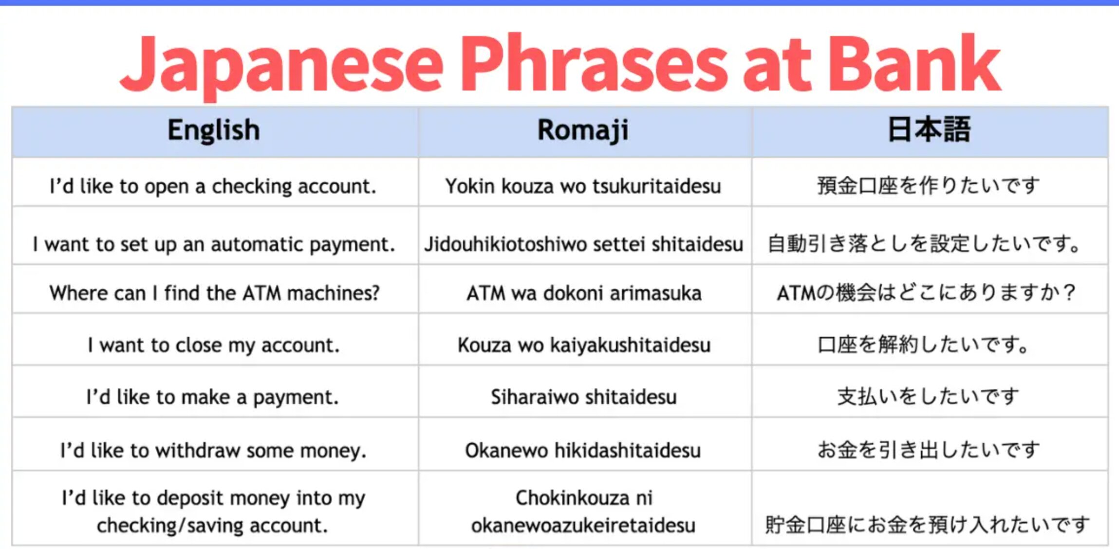 English-Japanese conversation at the bank. Japanese Words and Phrases You Can Take to the Bank. Japanese words and phrases you'll need for the bank